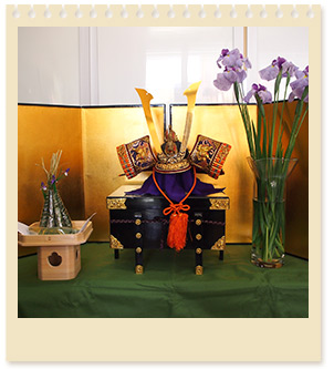 かぶと、菖蒲の花、柏餅、ちまき、そして園庭にはこいのぼりも泳いでいます。